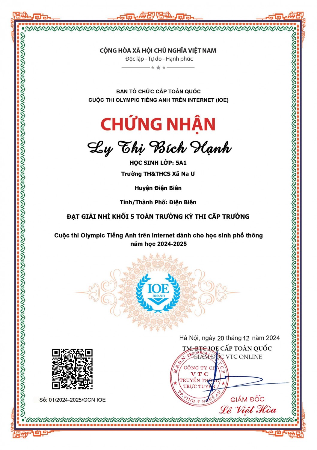 Chúc Mừng Các Em Học Sinh Tham Gia Cuộc Thi IOE Cấp Trường! Vừa qua, các em học sinh trường Tiểu học và Trung học cơ sở xã Na Ư đã xuất sắc tham gia cuộc thi IOE (Internet Olympiad of English) cấp trường. Cuộc thi không chỉ là sân chơi trí tuệ giúp các em rèn luyện và nâng cao kỹ năng tiếng Anh mà còn là cơ hội để các em thể hiện khả năng, bản lĩnh và sự sáng tạo của mình. Những Điểm Sáng Nổi Bật Trong Cuộc Thi: - Khả năng tiếng Anh vượt trội: Các em đã thể hiện kiến thức vững vàng về ngữ pháp, từ vựng và khả năng nghe, đọc, viết tiếng Anh. - Tinh thần thi đấu hết mình: Dù gặp phải những thử thách khó khăn, các em vẫn luôn giữ vững tinh thần lạc quan, tự tin và nỗ lực hết mình. - Sự sáng tạo và nhạy bén: Các em đã thể hiện sự sáng tạo trong cách làm bài và khả năng nhạy bén trong việc giải quyết các tình huống. - Chúc mừng tất cả các em học sinh đã hoàn thành xuất sắc phần thi của mình! Các em chính là niềm tự hào của nhà trường và là tấm gương sáng cho các bạn cùng trang lứa noi theo. Chúc các em tiếp tục phát huy những thành tích đã đạt được và gặt hái nhiều thành công hơn nữa trong những cuộc thi sắp tới. - Hãy cùng chúc mừng và ủng hộ các em học sinh trường Tiểu học và Trung học cơ sở xã Na Ư!