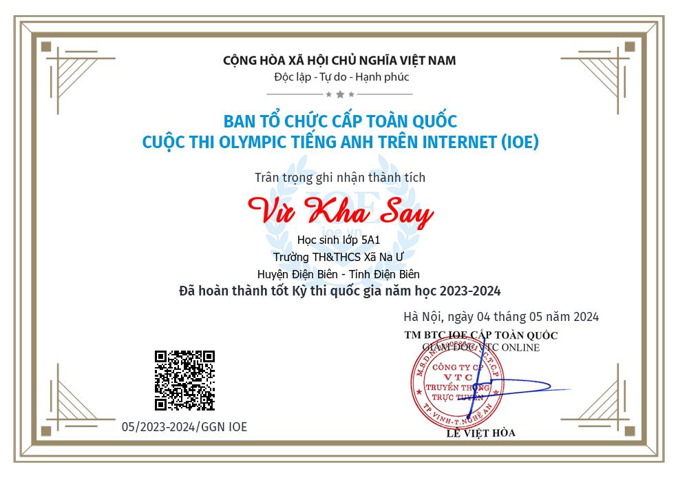 Chúc mừng em: Vừ Kha Say học sinh lớp 5A1 đã hoàn thành tốt kỳ thi IOE cấp quốc gia năm học 2023-2024.